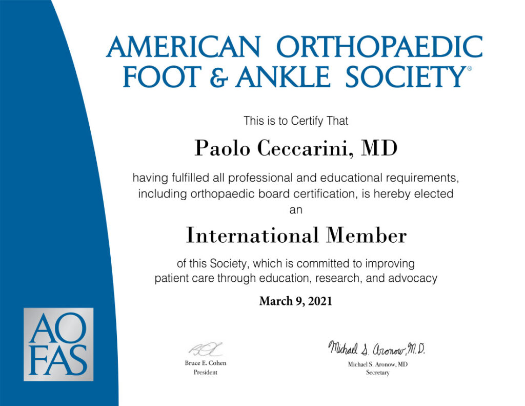 Dopo gli studi universitari, ha proseguito la sua formazione presso il Department of Orthopaedic Surgery and the Orthopedic Research Center di Amsterdam (Olanda), diretto dal Prof. CN Van Dijk con una Fellowship in “Ankle arthroscopy and hindfoot endoscopy”.